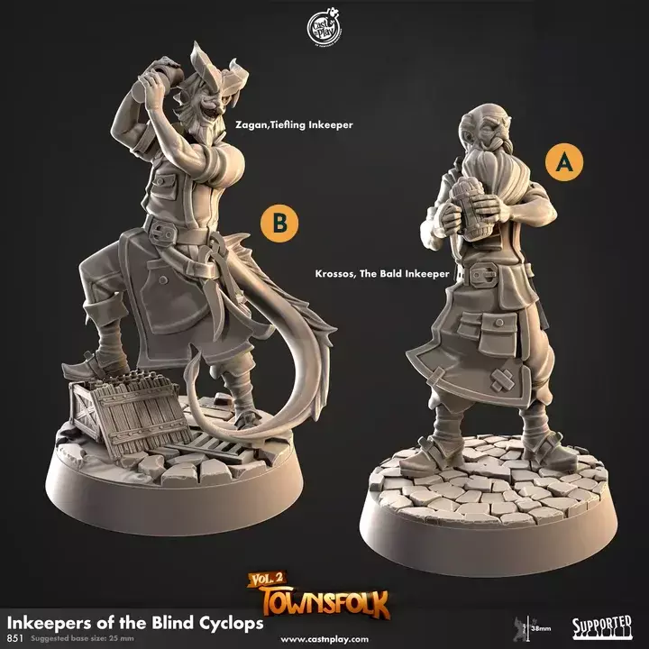 Os Taverneiros do Bar Ciclope Cego trazem vida às suas tavernas e cidades! Cada miniatura 3D em resina cinza semi-flexível representa NPCs detalhados, ideal para encontros e cenas de roleplay.